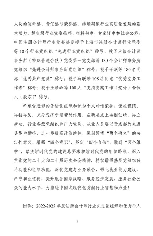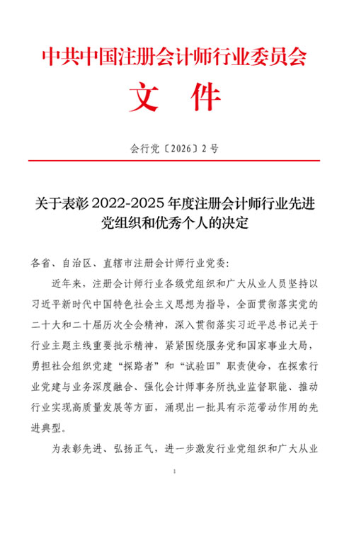 近日,收到中共中國注冊會計師行業(yè)委員會文件《關(guān)于表彰2022-2025年度注冊會計師行業(yè)先進(jìn)黨組織和優(yōu)秀個人的決定》,我所主任會計師吳林海同志榮獲注冊會計師行業(yè)“優(yōu)秀黨務(wù)工作者”稱號。